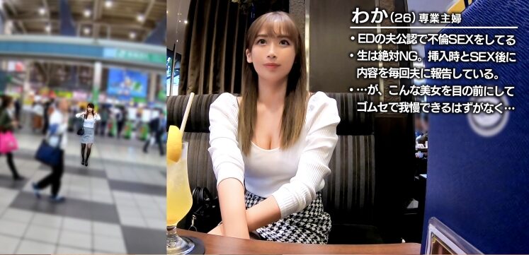 エッチ大好きなシロウト女子と遊んで、さらにエロい友達を紹介してもらうエロカワ女子数珠繋ぎ企画。今回の美女は夫がEDになり公認でSEX相手を探す主婦わかさん26歳。清楚で大人しそうな雰囲気からは想像出来ない隠れ淫乱ぶり炸裂!!ハメ潮ぶちまけ我を忘れてイキ狂いSEX!!
